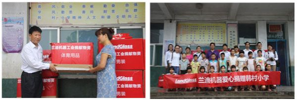 2014年7月10日,兰迪机器 (LandGlass)工会王主席以及十余名员工代表,将公司全体员工为偃师大口乡韩村小学捐赠的十余箱物资,送至韩村小学。