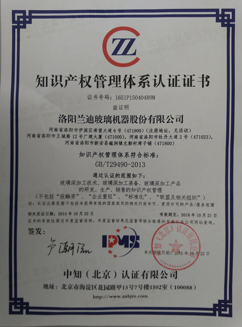 近日,兰迪机器顺利通过国家知识产权管理体系认证,获得了中知(北京)认证有限公司颁发的《企业知识产权管理规范》(GB/T29490-2013)管理体系认证证书,标志着兰迪机器在知识产权创造、运用、管理和保护方面处于国内领先水平,体系认证工作走在了河南省数十家知识产权管理体系贯标工作试点企业的前列。
